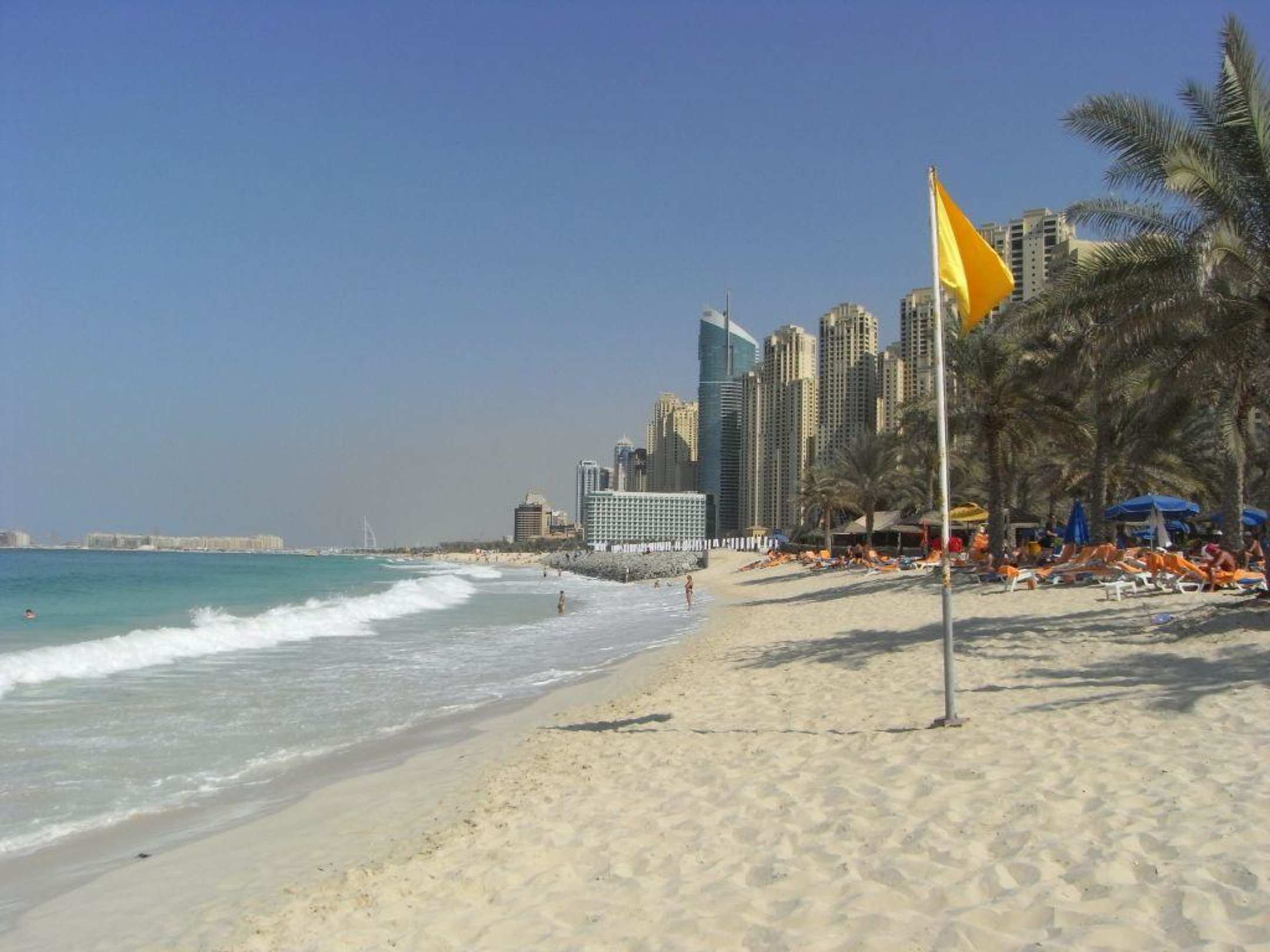 Hilton HotelDas Hilton Hotel befindet sich genau in der Mitte des Bildes. Dahinter die eindrucksvolle Hochhausfront. Das Bild wurde vom hoteleigenen Strand des Sheraton Jumeirah Beach aufgenommen.