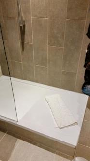 Die Dusche ist nur mit einer kleinen Glaswand versehen. Wer nicht aufpasst, der macht alles nass.