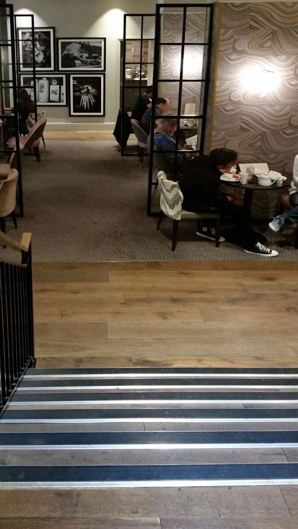 Das zum Thema Barrierefreiheit. Im Hintergrund geht's zum Frühstücksbuffet. Man kann zwar im oberen Bereich an diversen Tischen frühstücken; nur derjenige, der gehbehindert ist, der hat ein echtes Problem. Das zum Thema Barrierefreiheit.