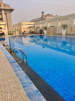 Pool des Hilton Garden Inn. Im Hintergrund links das Hotelgebäude.