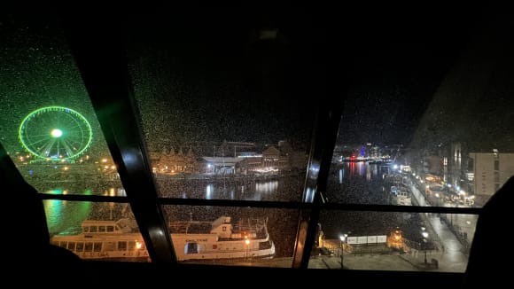 AusblickZimmerausblick bei Nacht (2024 nach Make-Over (neuer Boden, neue Wandverkleidung, Stuhl, Sessel und Sofa ebenfalls neu))