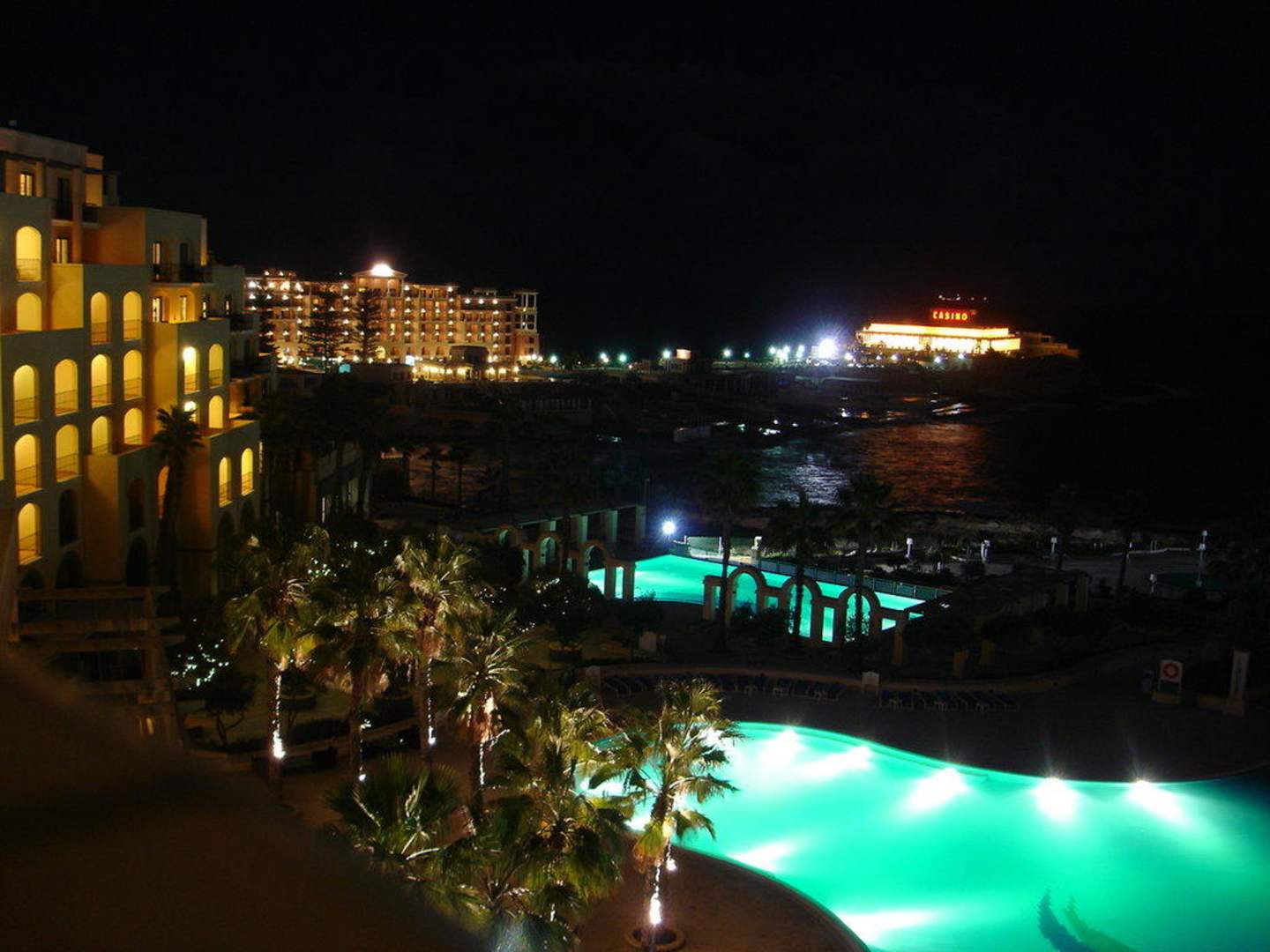 Nächtliche Poollandschaft, im Hintergrund das Casino