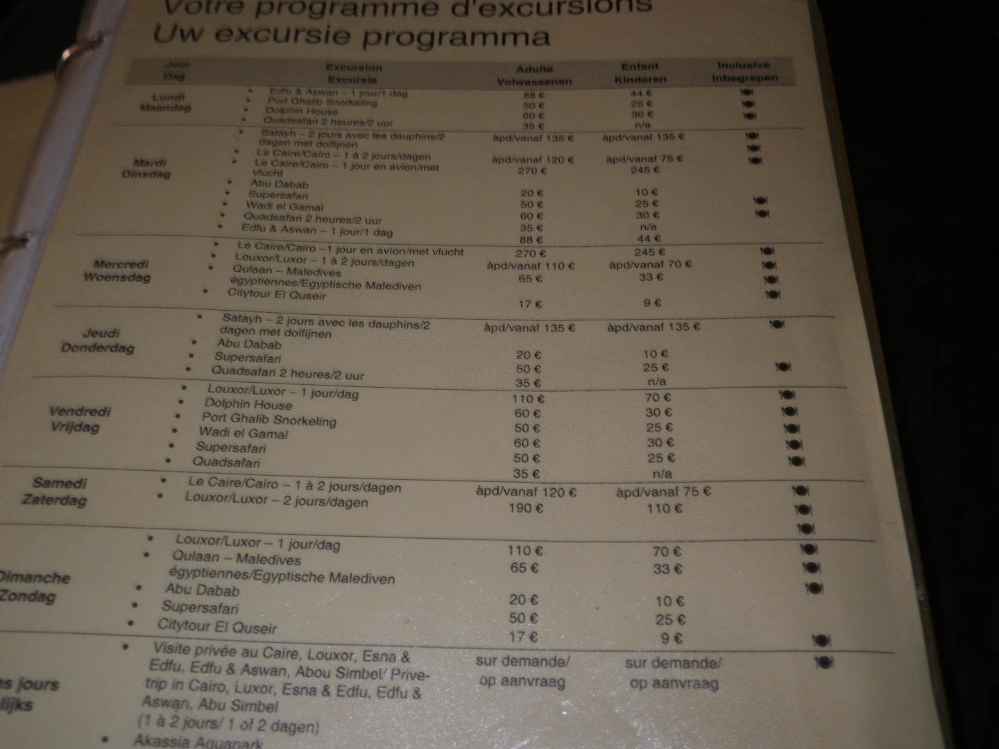 Tarif excursions