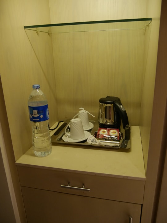 Tee/Kaffeeutensilien, darunter Kühlschrank
