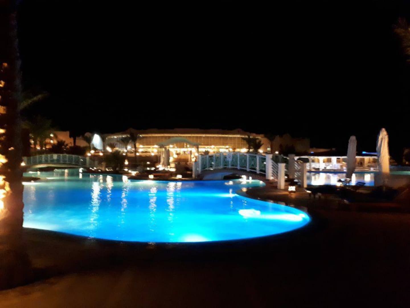 Pool und Hauptgebäude wunderbar beleuchtet in der Nacht....
