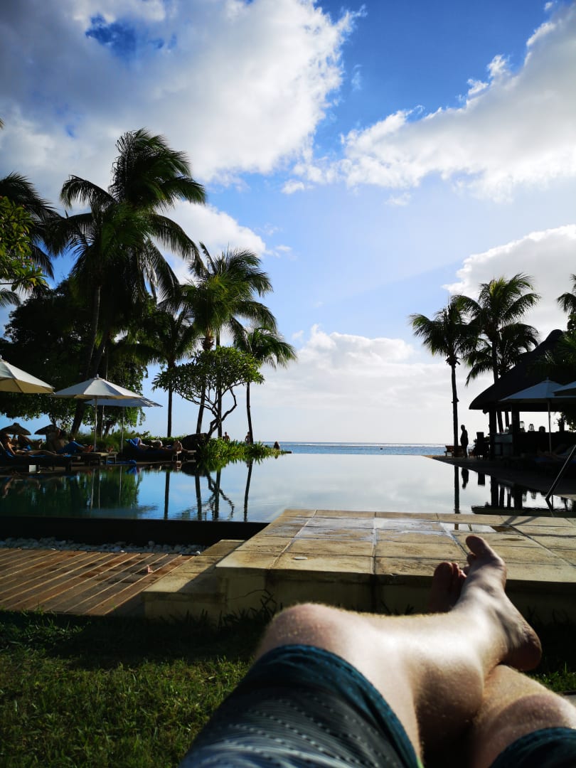 Blick von der Liege auf den Infinity Pool tagsüber.