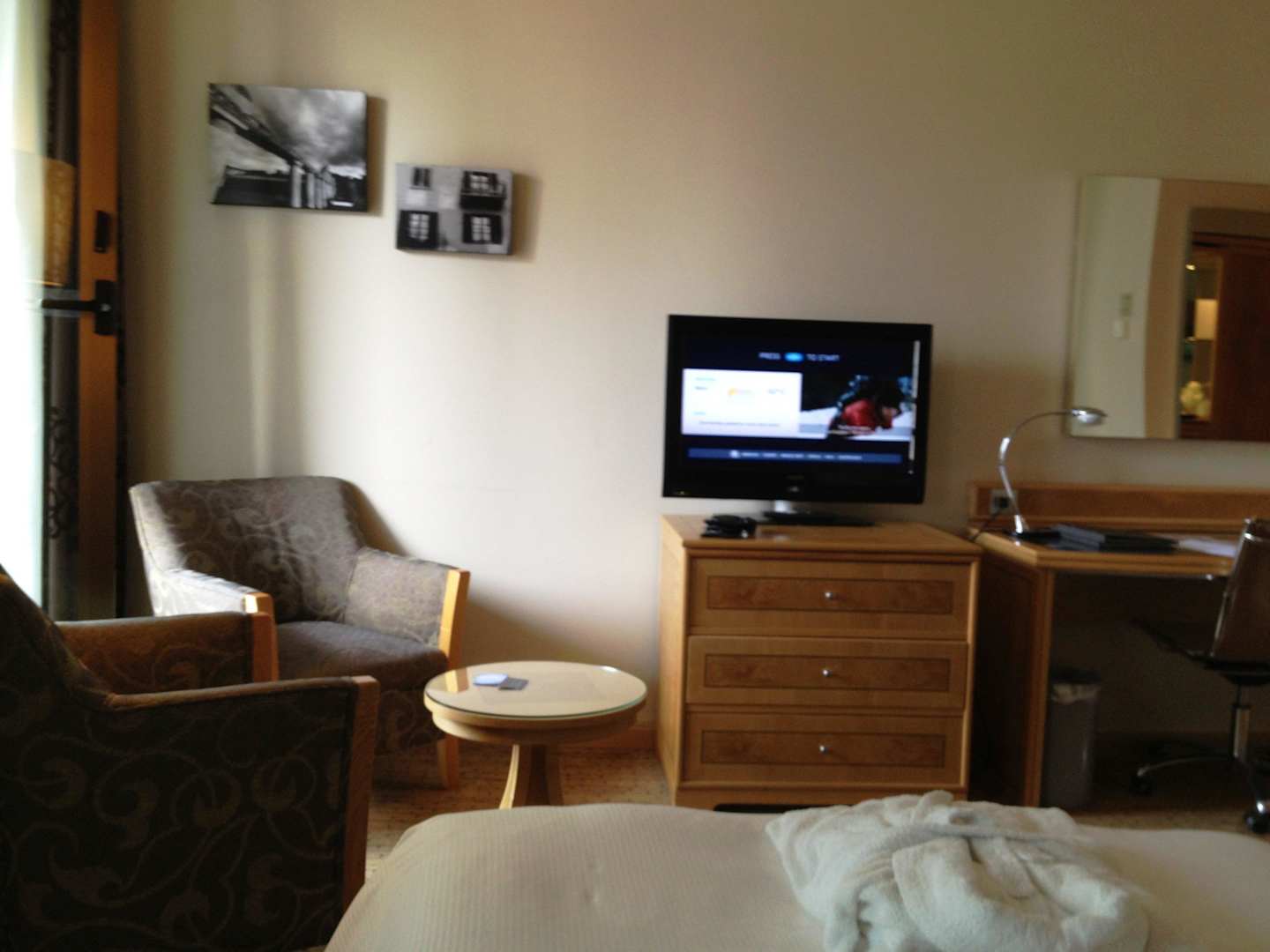Blick vom Bett auf Fernseher und Anrichte