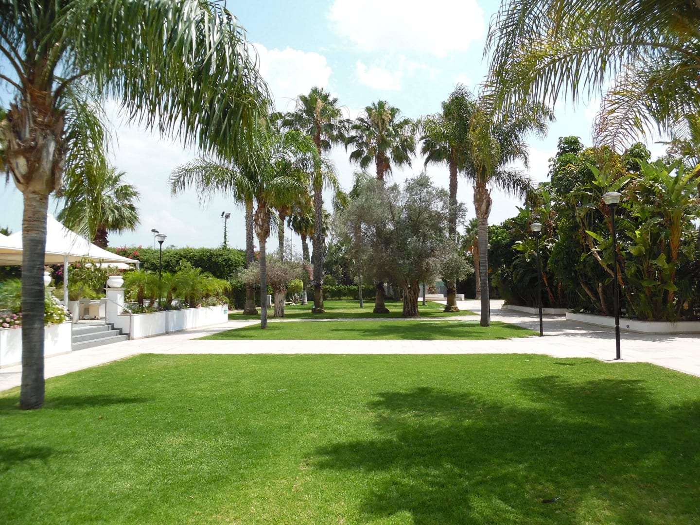 Wiese zwischen Pool und Hotel