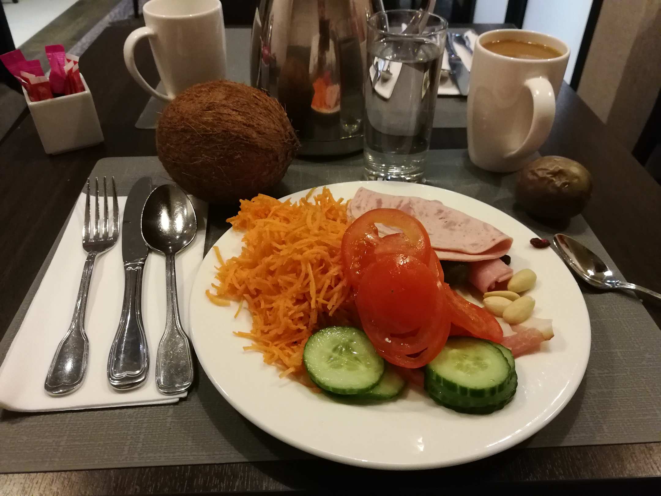 Frühstück. Ein paar gesunde Speisen (Gemüse, Rohkost) war vorhanden, aber die Auswahl fehlte.