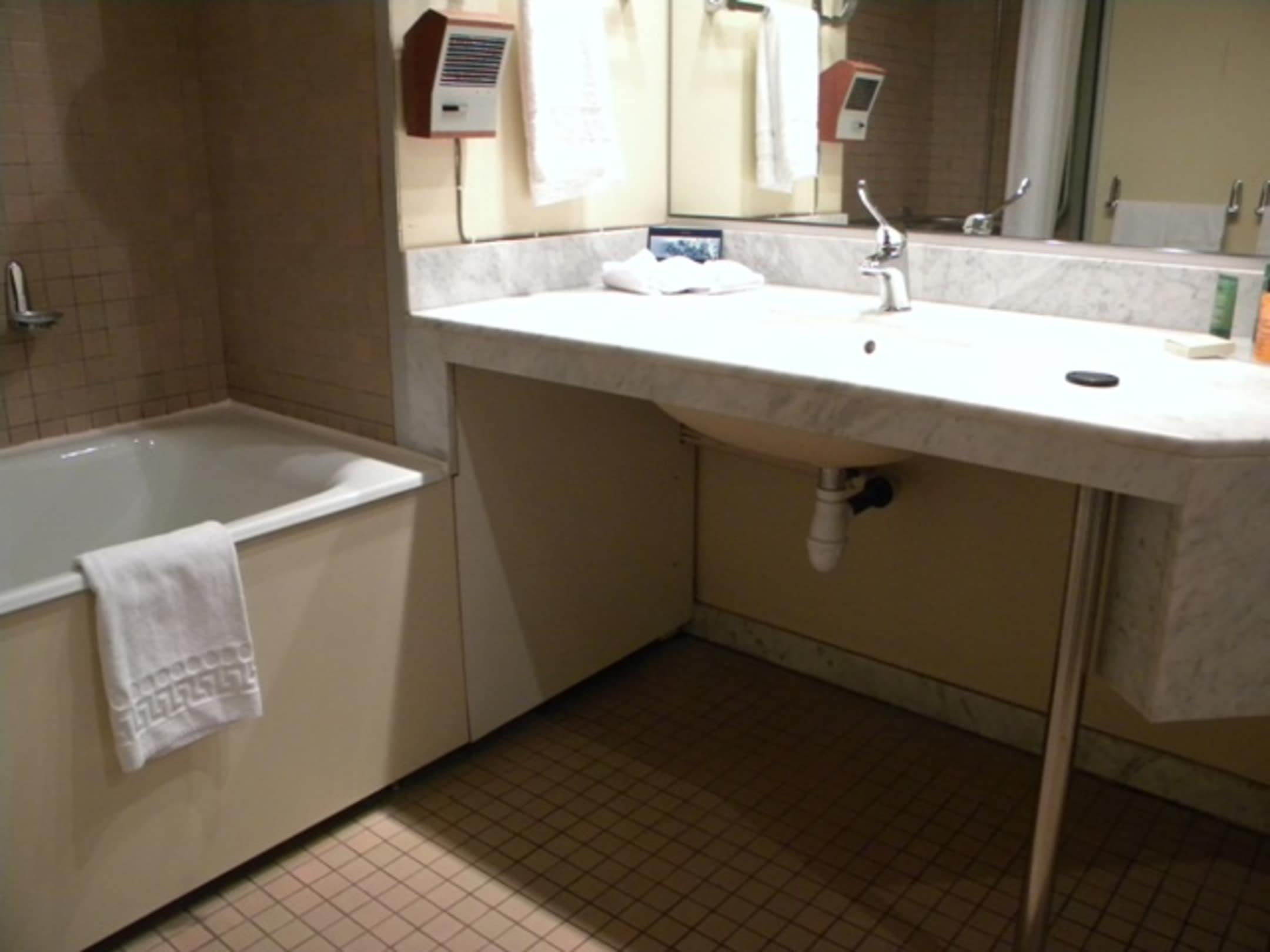 Verleidung der Wanne + oben links neben dem Waschtisch und undefinierbares Elektro-Geraet neben dem Waschtisch (man beachte auch die Elektroleitung "auf Putz" !