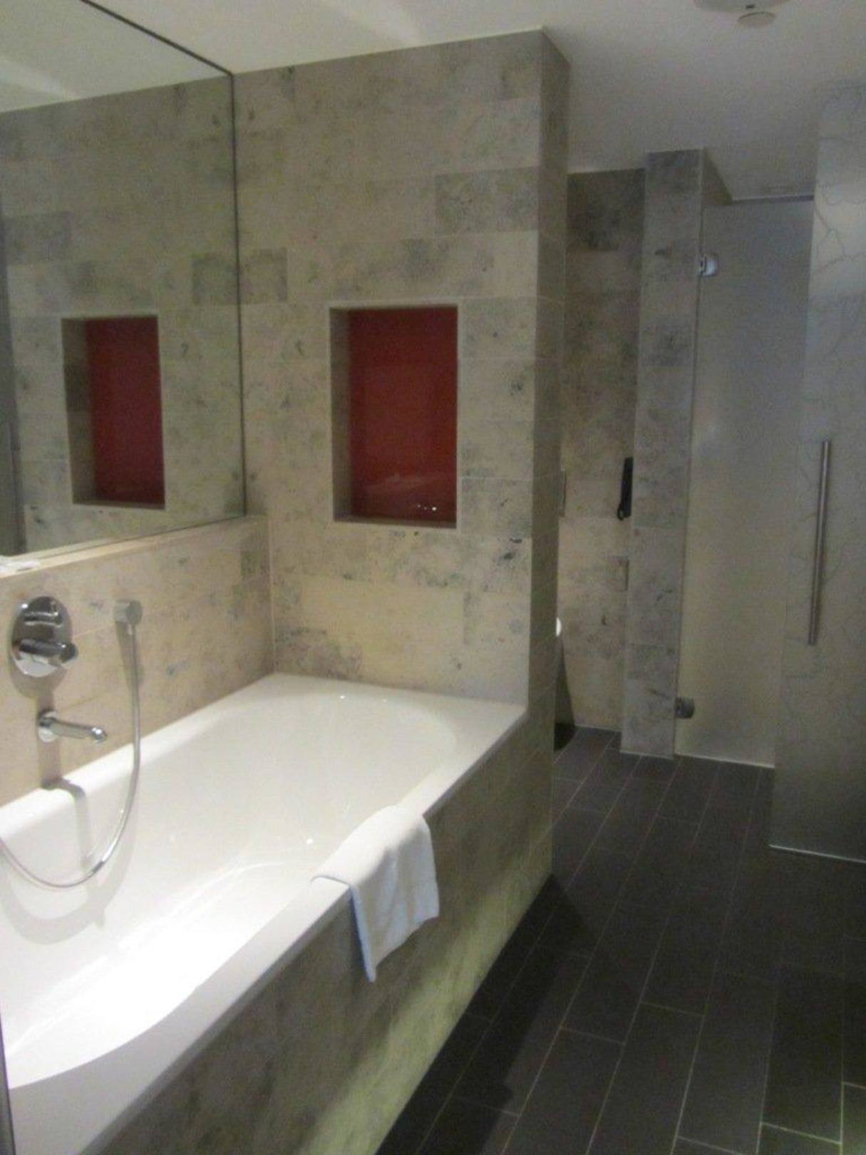 Badewanne und hinten die Dusche