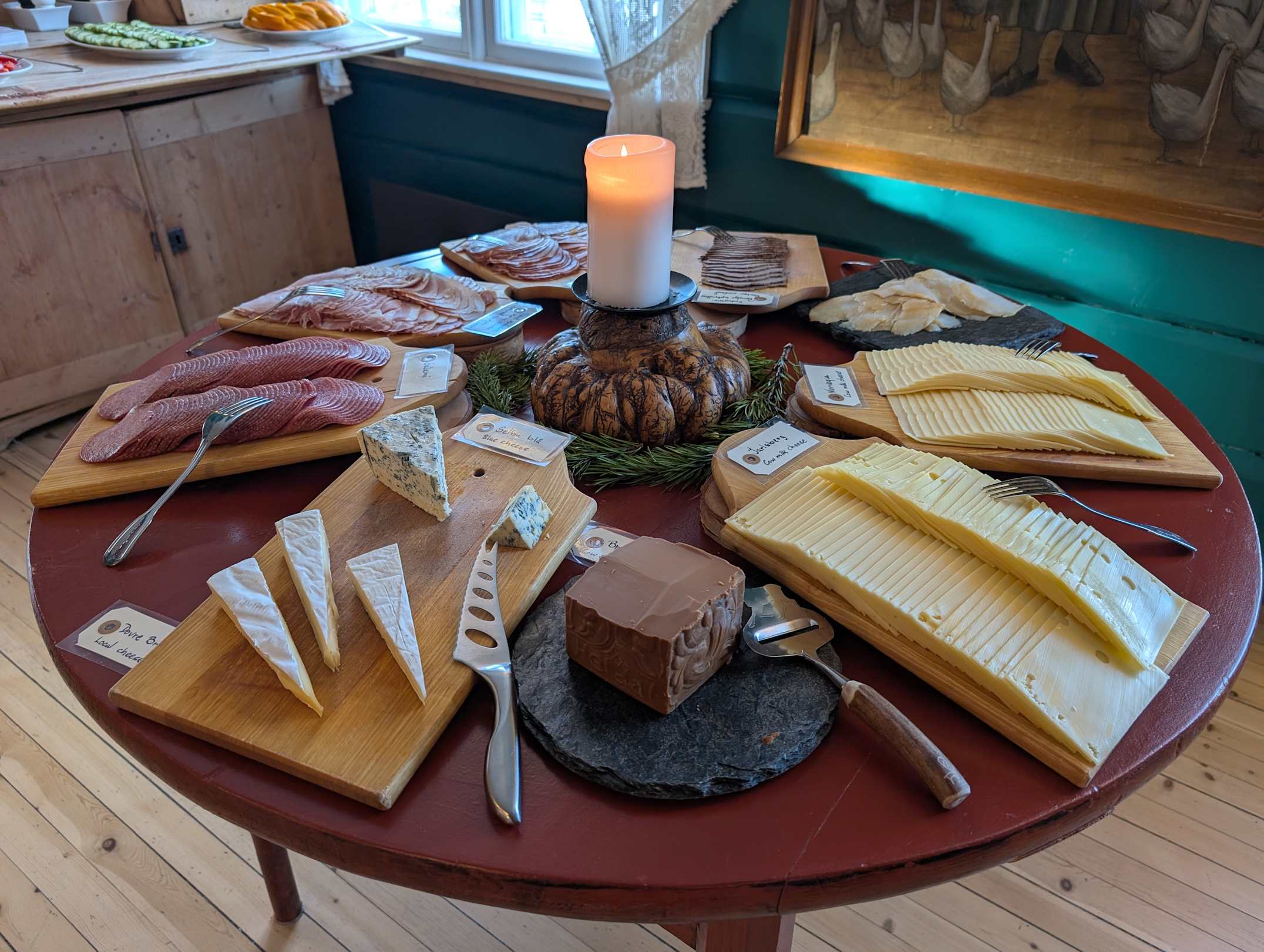 Frühstücksbüffett: Wurst, Fisch, Käse einschl. norwegischem Brunost (karamelisierter Braunkäse)