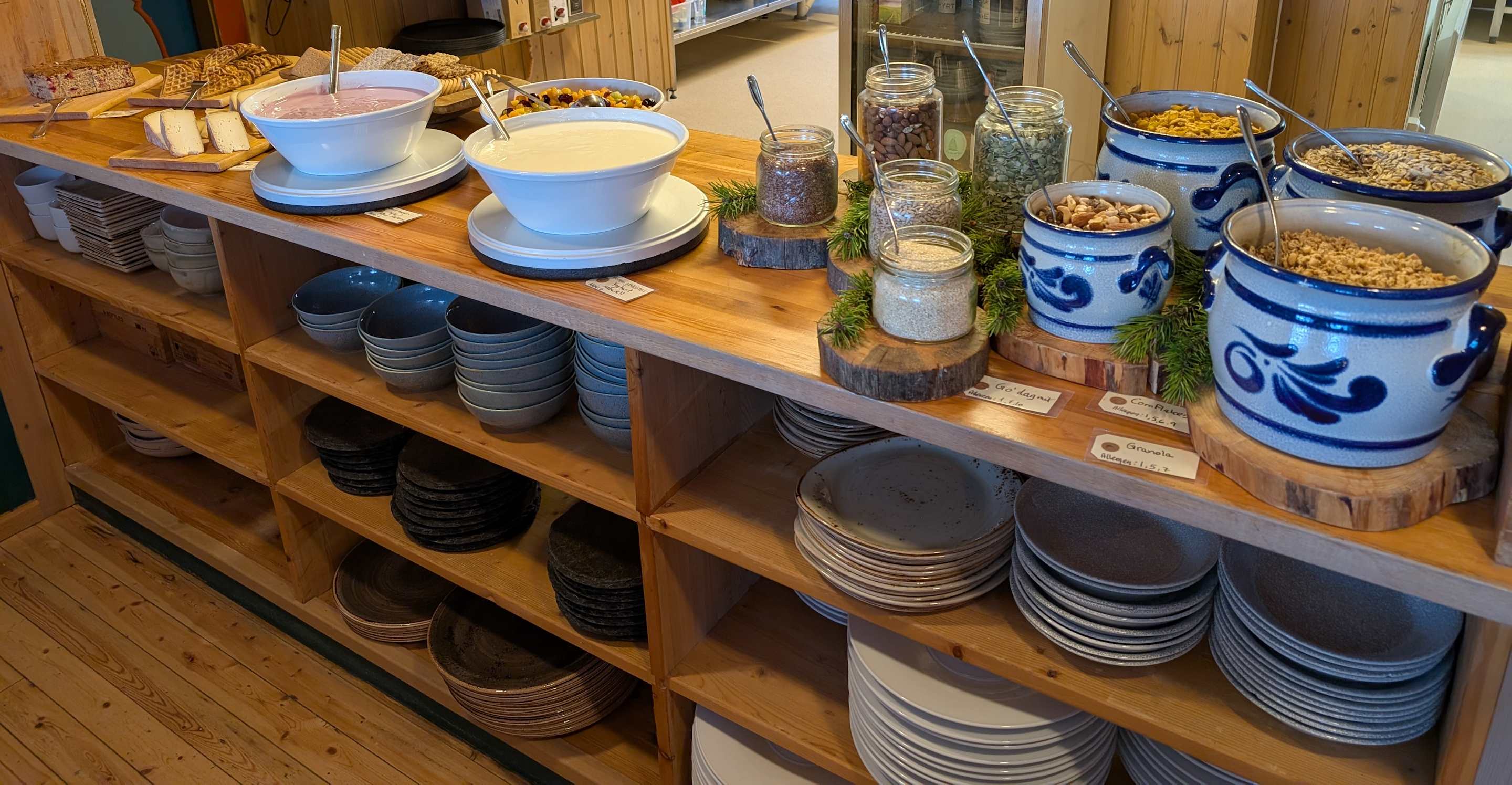 Frühstücksbüffett: gute Auswahl an Müsli, Nüssen, Obstsalat, Joghurt und Gebäck