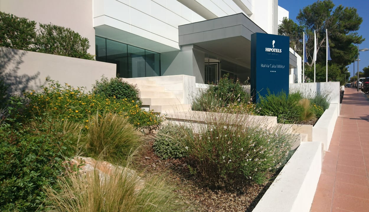 LobbyHoteleingang mit vielen verschieden blühenden Pflanzen, ideal für Bienen und andere Insekten.