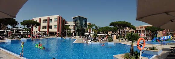 Blick auf Pool, hinten links unten Poolbar, Miniclub. Hinten rechts: Kinderbereich, Hotel im Hintergrund. Alles sehr sauber und BADEMEISTER!!! Am anderen Ende gäbe es noch einen weiteren Pool. Es waren immer genug Liegen da (Mai/Juni).