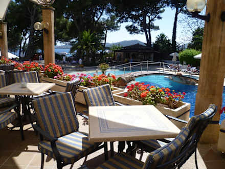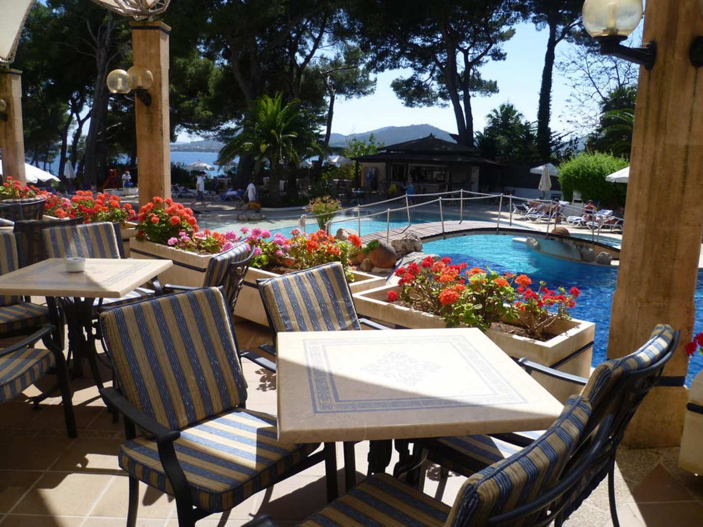 Blick von der Speiseterrasse auf den Hotelpool
