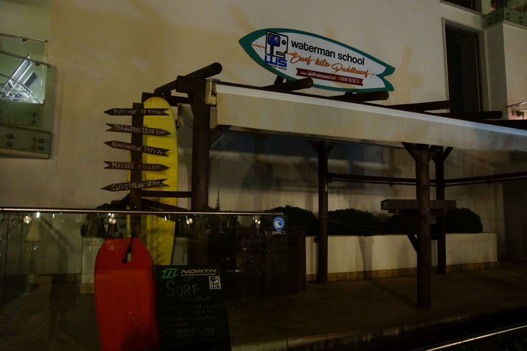 Poolanlage in der Nacht. Kleine Surfschule ist ebenfalls vorhanden