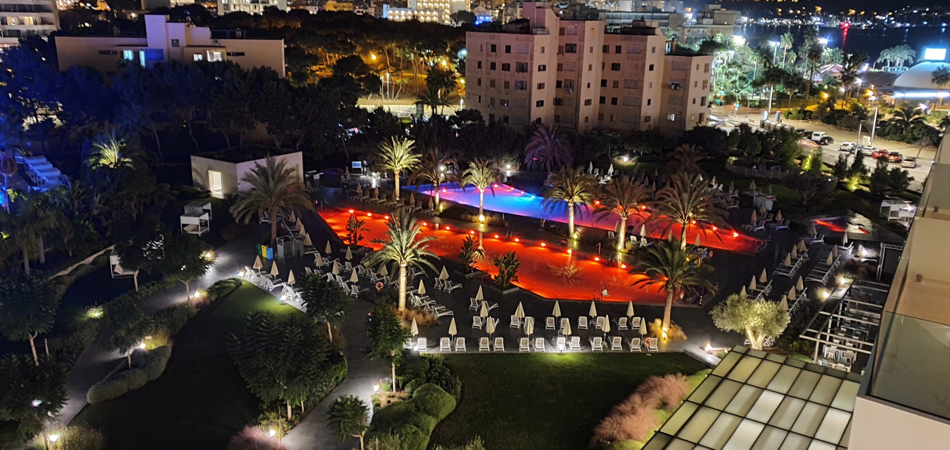 Blick aus Poolblickzimmer 6. Etage nachts Haloween, Pools ROT