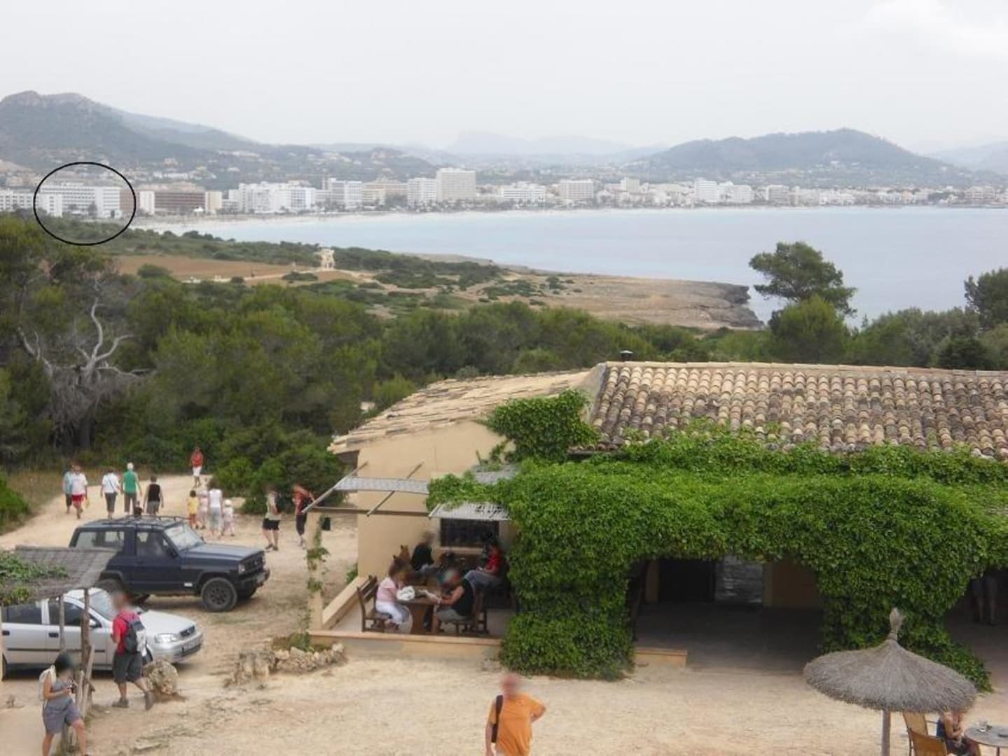Cala Millor und das Hotel (Kreis) vom Castell de sa Punta de n’Amer aus gesehen