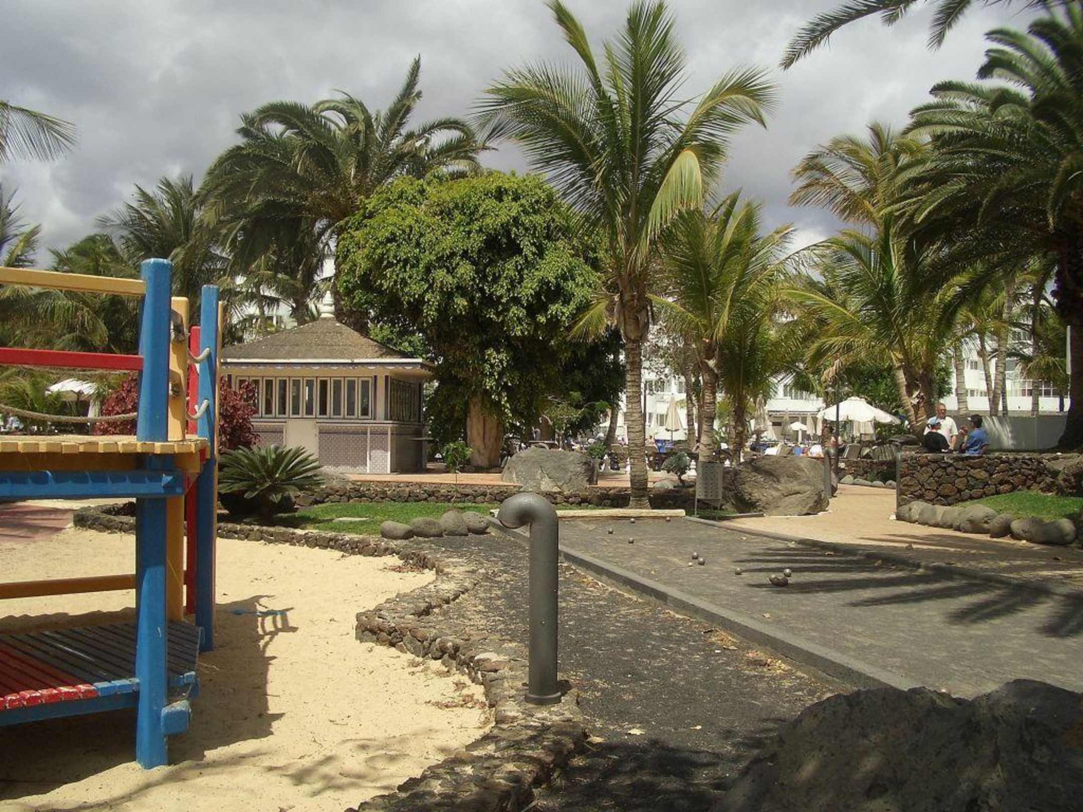 En primer plano, detalle del parque infantil y de la cancha de petanca. A medio término el bar piscina y el ajedrez de jardín. Al fondo la piscina y el solarium