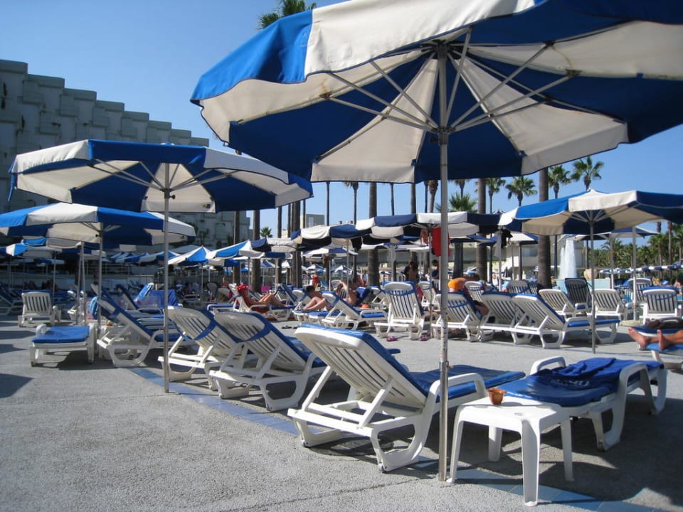 Liegen und Sonnenschirme am Pool