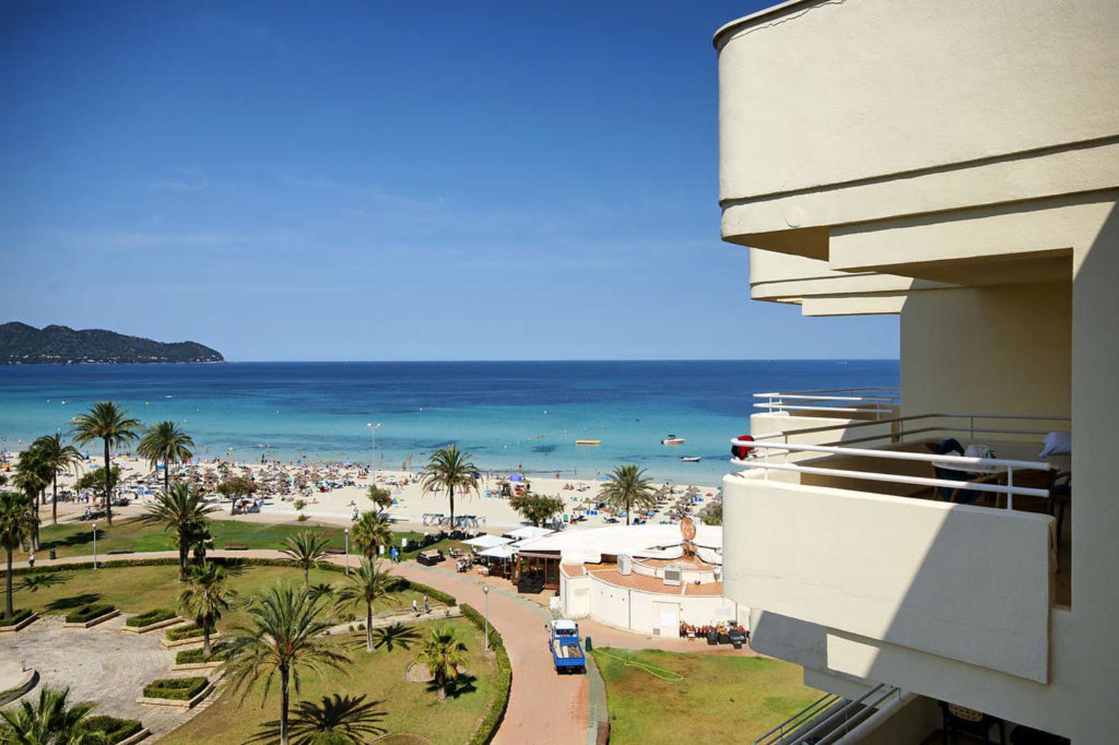 Aussicht vom Balkon auf Sandstrand von Cala Millor.