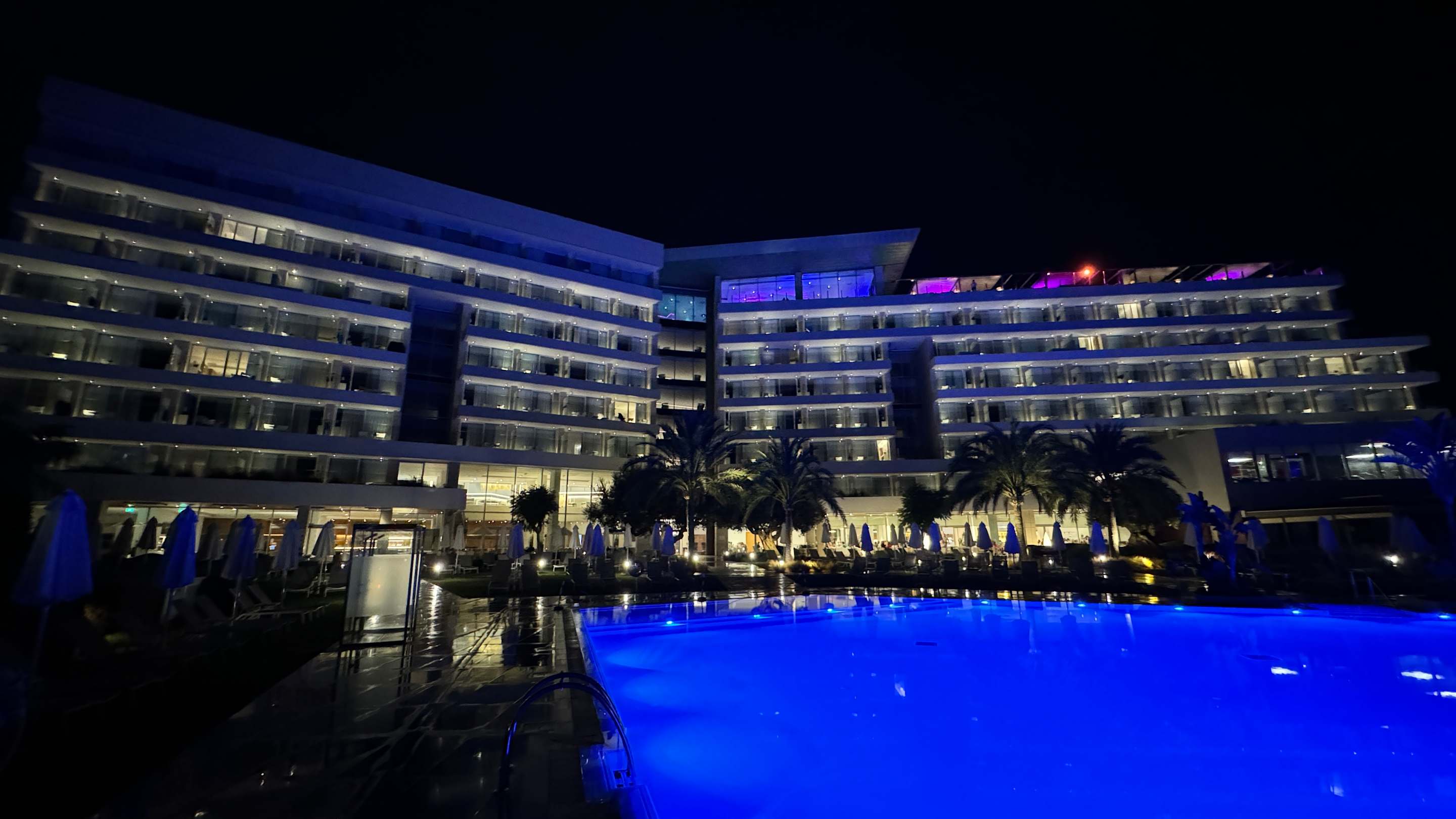 Blick auf das Hotel, oben rechts: Rooftop- Bar