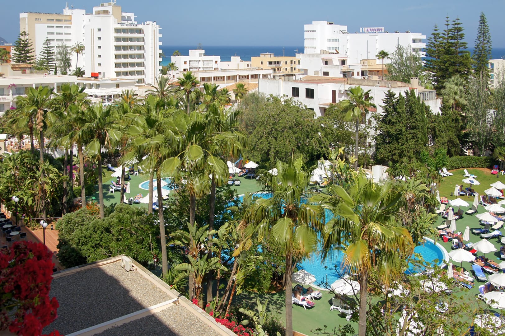 Aussicht aus 4 Etage auf Pool-Garten und Umgebung.