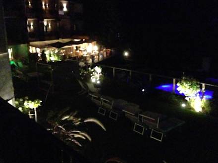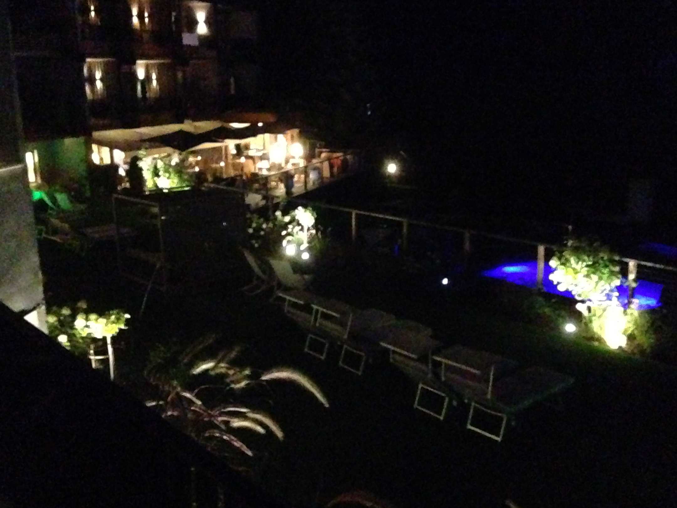 Abendlicher Blick auf Terrasse und Pool.