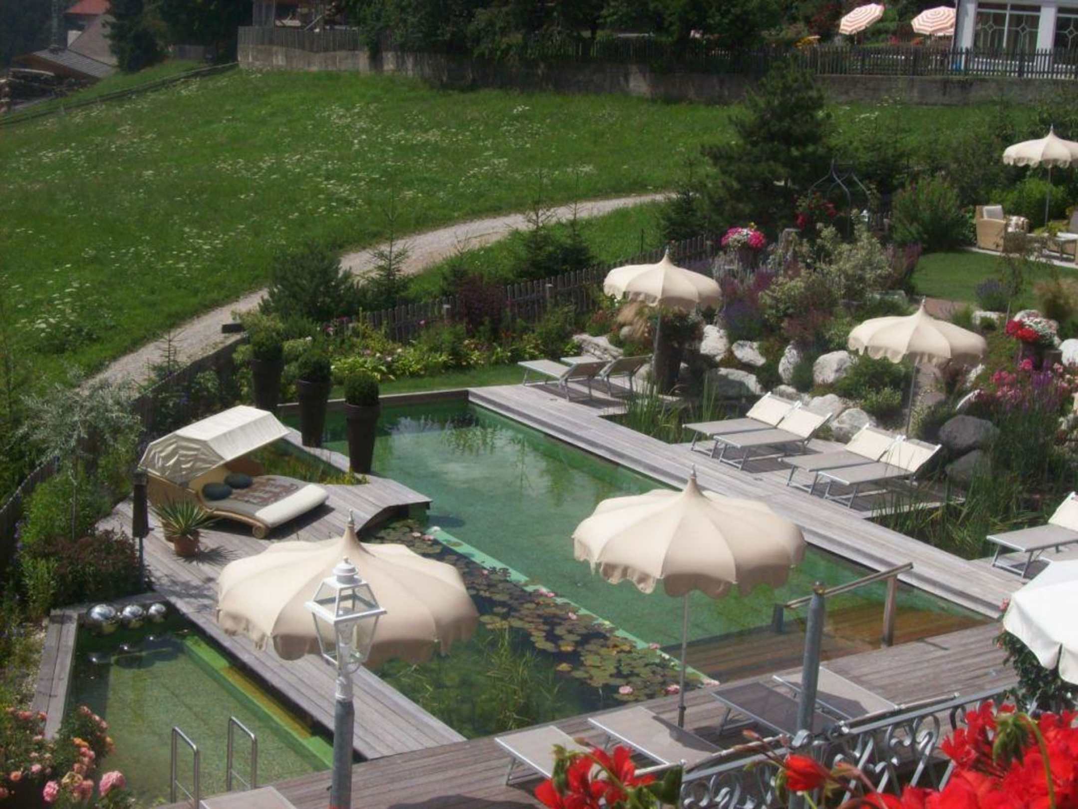 Blick von Suit Himmelsreich in den Garten mit Schwimmteich