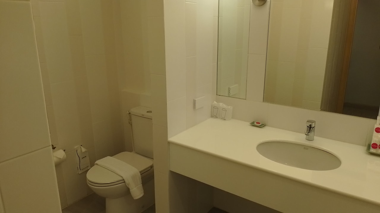 Blick Toilette und Waschbecken.