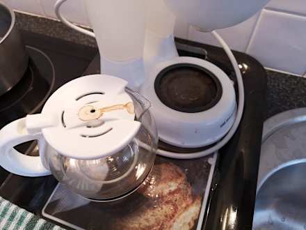 Zimmervon den Vornutzern hinterlassene verschmutzte Kaffemaschine Bungalow 158 - wurde beim Bettenwechsel nicht gesäubert