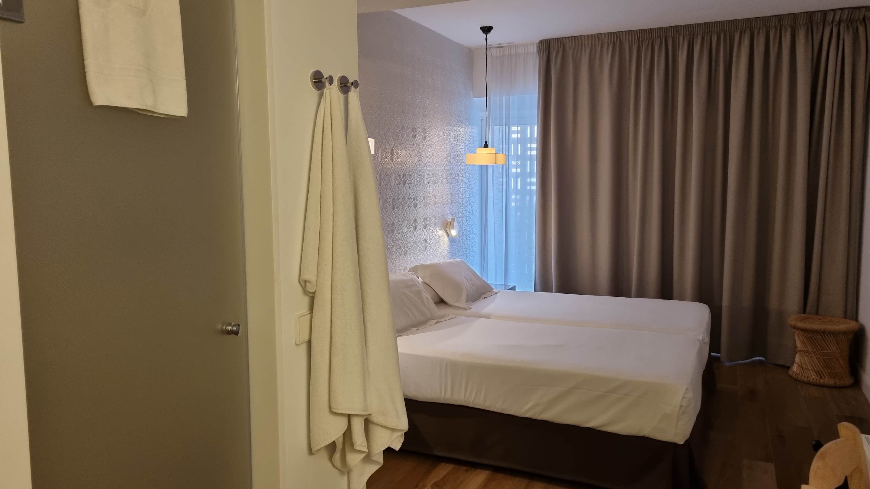 Blick auf das Bett, links die Dusche. Die Tür davor ( nicht zu sehen) die Toilette