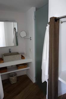 Links Waschbecken, rechts WC und 2. Schrank