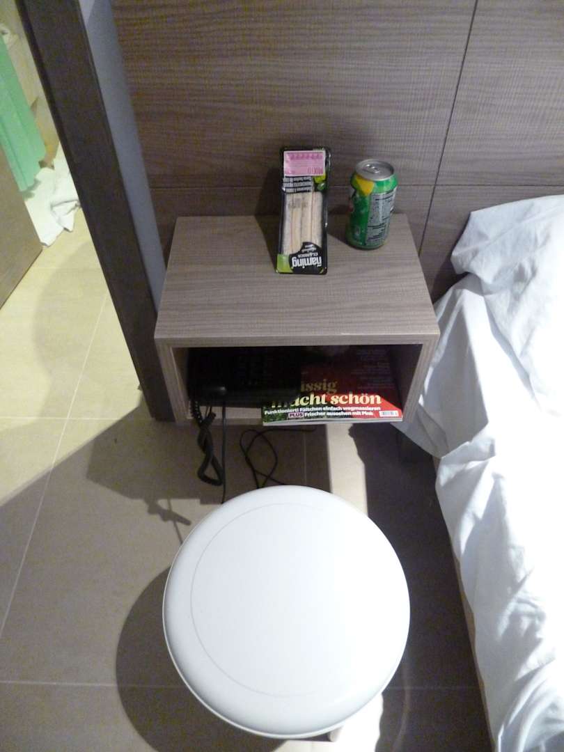 Mit dem Badezimmerhocker und dem abgeräumten Nachttisch habe ich mir dann einen improvisierten Tisch für das Frühstück am Abreisetag hergerichtet.