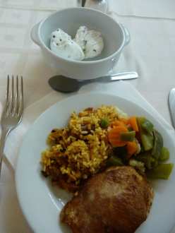 Beispiel - AbendessenFleisch mit Reis und Gemüse und Stracciatella Eis als Nachtisch.
