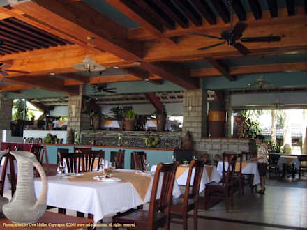 Restaurant des Oriental Pearl Resort (Hoang Ngoc)Drei Ebenen bilden das Restaurant, wobei es sich um keine vollwertigen Stockwerke handelt, eher Abstufungen. Das Restaurant ist nach allen Seiten offen und praktisch von allen Bereichen gut erreichbar. Sei es von der Hotellobby, dem SPA-Zentrum oder dem Pool bzw. Strand. Nach unserem Empfinden hat man immer einen angenehmen Blick egal wo man sitzt. Entweder in den Garten bzw. über den Pool auf Palmen und Meer oder zur künstlich angelegten Teichlandschaft. Im Restaurant ist eine kleine Bühne (links, außerhalb des Bildes), auf der abends eine Band spielt. Das Bild wurde von der untersten Ebene aus gemacht. In dem Bereich links oben im Bild wird das Frühstücksbuffet aufgebaut.