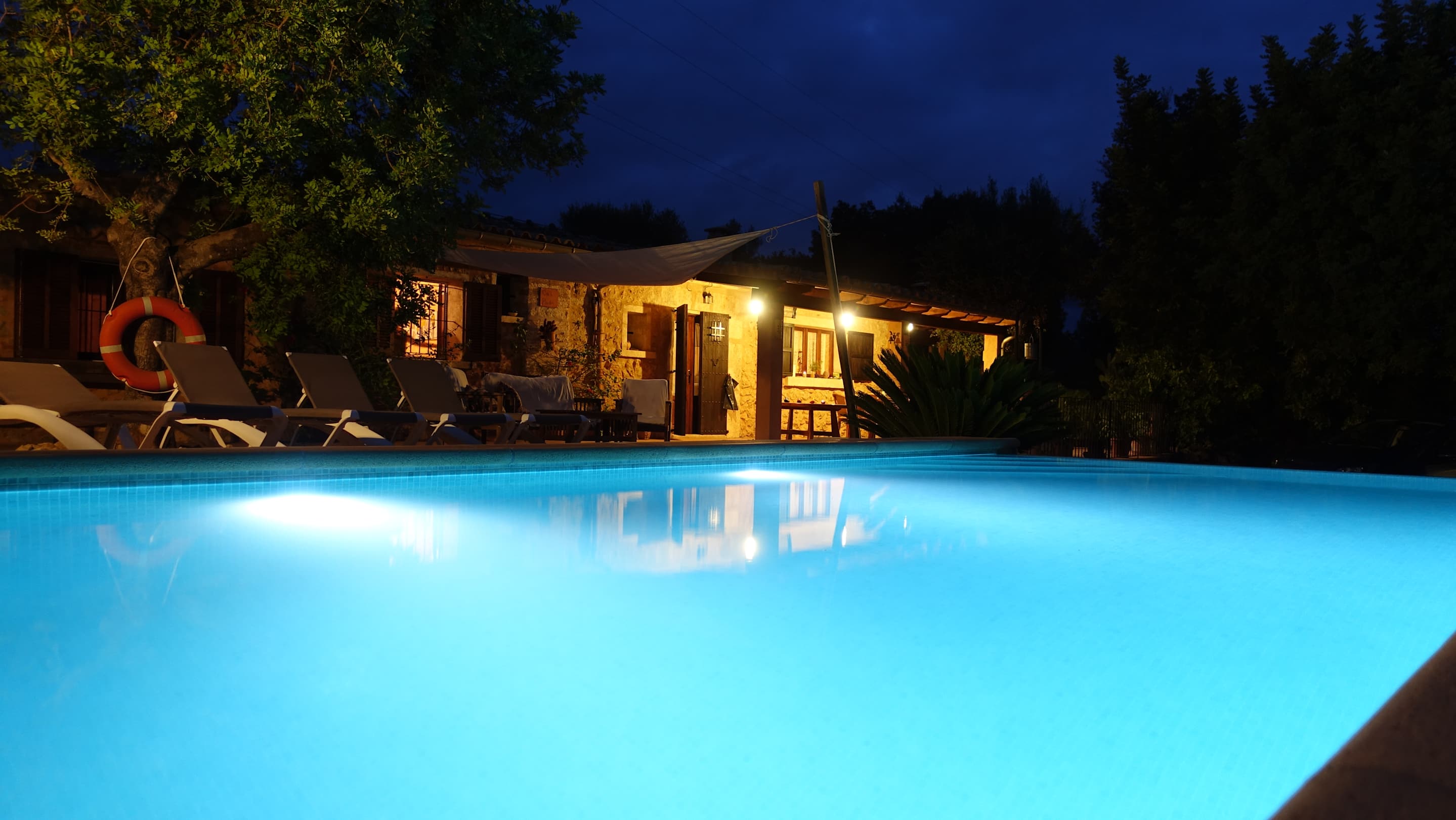 Pool mit Finca bei Nacht
