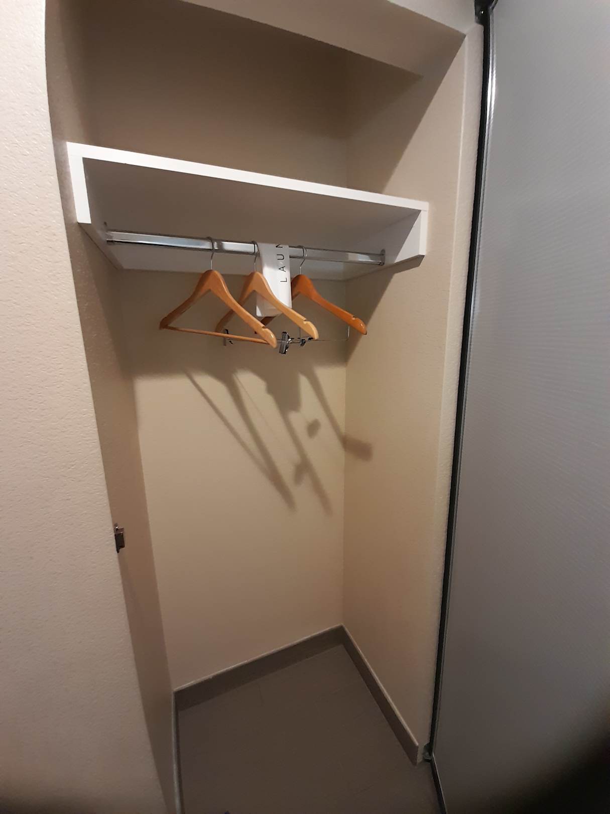 ZimmerKleidernische mit 3(!) Kleiderbügeln - die Aufforderung, hier nicht lange zu bleiben, ist nicht zu übersehen.