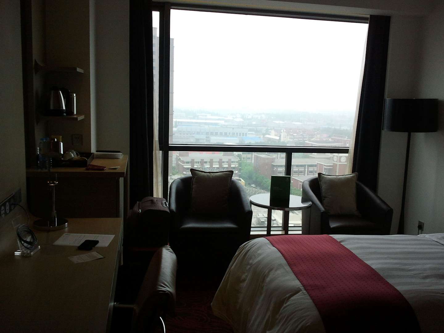 Blick ins Hotelzimmer mit Ausblick auf die Stadt im 13. Stock.