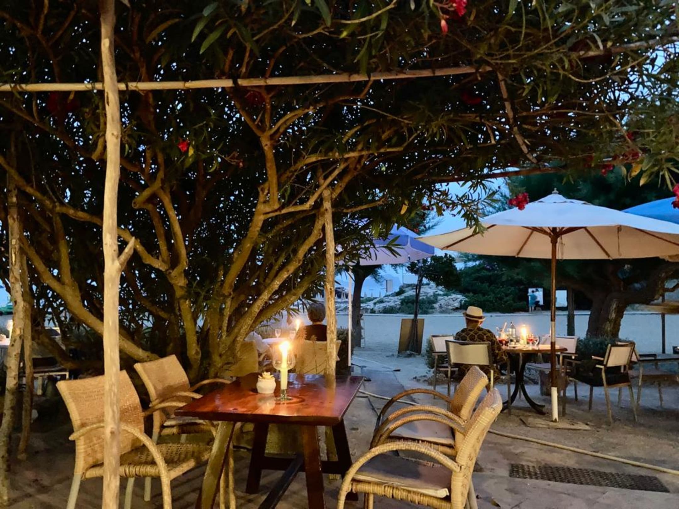 Romantische Strandterrasse unter Oleanderbueschen