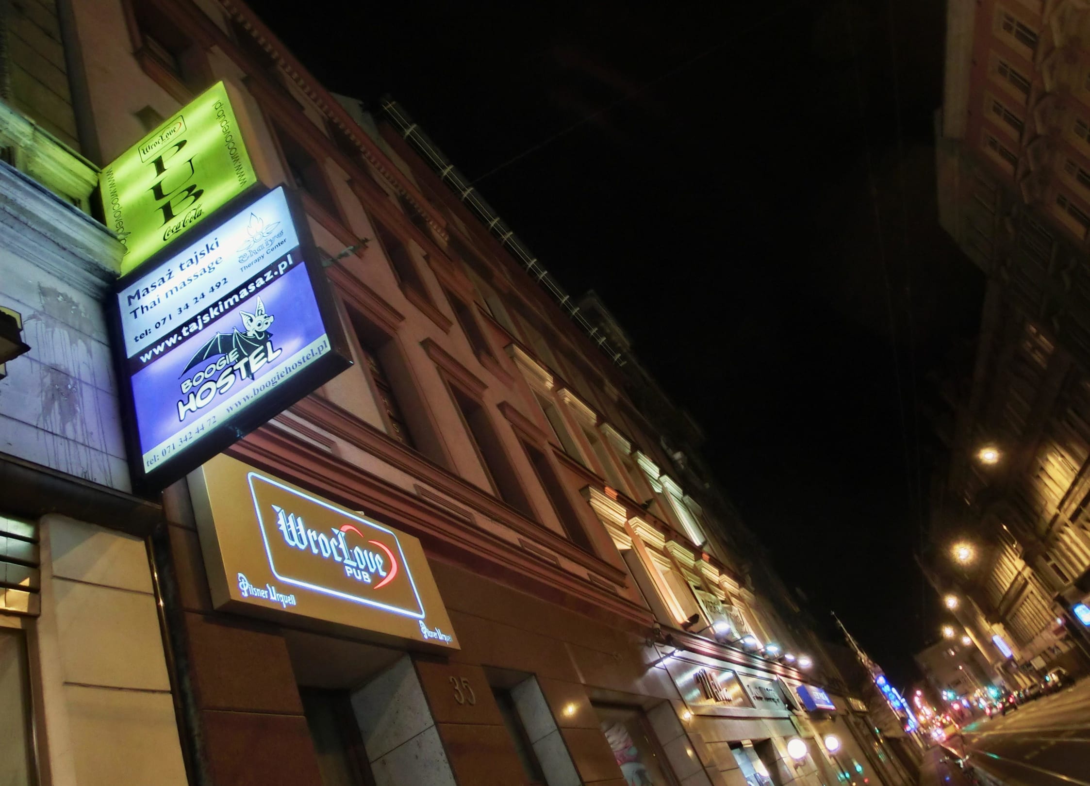 Außenansicht des Hostels bei Nacht