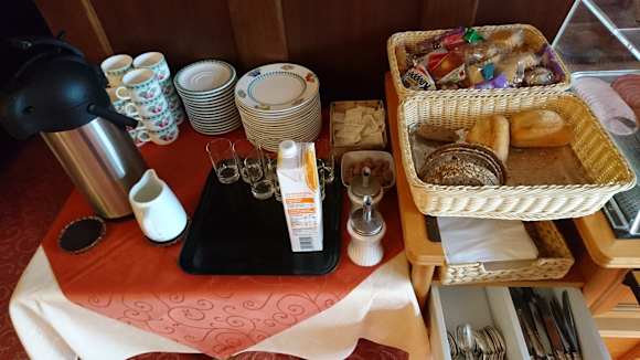 GastroFrühstück, den Tisch musste man mit Geschirr und Besteck selbst decken.(man bedenke 4-Sterne)