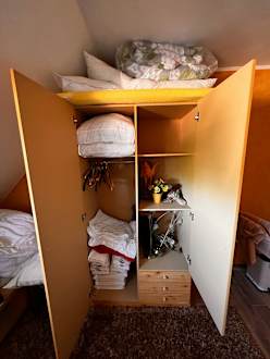 Voller Schrank mit Sachen für und aus dem Hotel = Abstellkammer