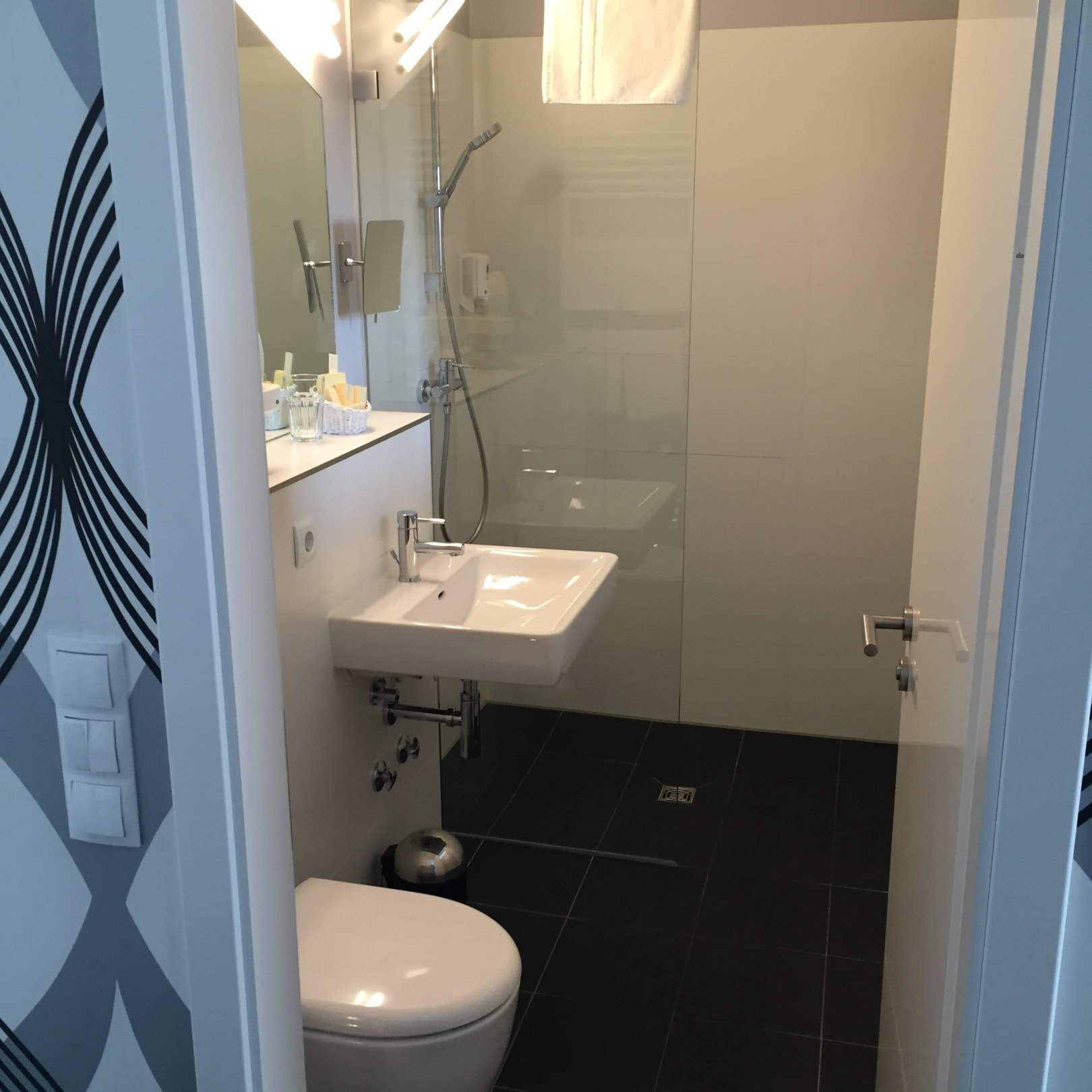 Bad mit WC und Dusche und Tageslicht über Zimmer
