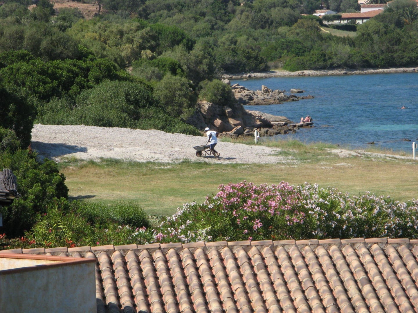 Hotelmitarbeiter reinigt Strand