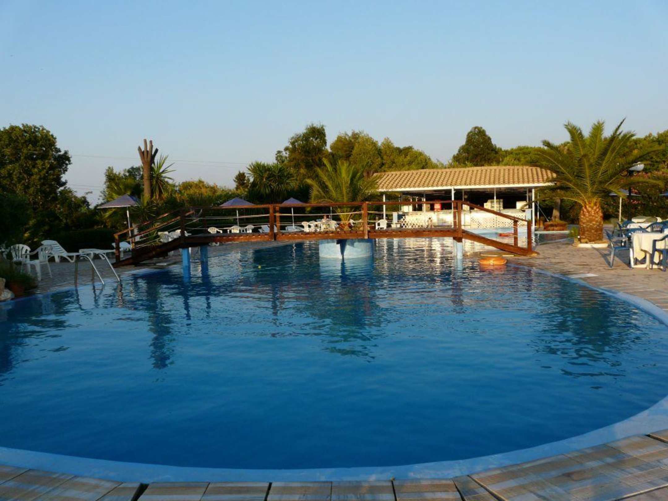 Sehr schön gelegen mit Meerblick und sehr ruhig. Nie viel los. Im Hintergrund die Bar.