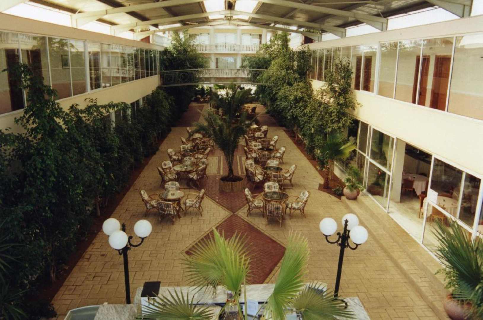Die Mall mit der Main Bar des Hotels AchaiosBlick von der Brücke in der Mall an der Glasfassade zum Swimming Pool: Unten die Main Bar, rechts das Restaurant; Blick auf die mittige Brücke in der Mall; nur im hinteren Teil (in Richtung Empfangshalle) ist auch eine zweite Etage.
