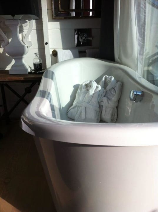 Freistehende Badewanne neben dem Bett