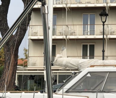 Blick auf unseren Balkon vom Mietboot aus.